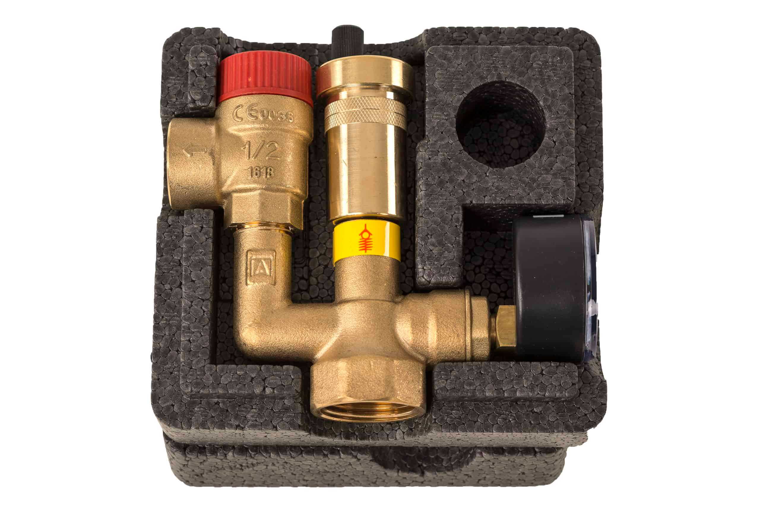 Sikkerhetssett for varme og kjøle-systemer, inkl automatlufter, 3 bar sikkerhetsventil, 0-4 bar manometer.
