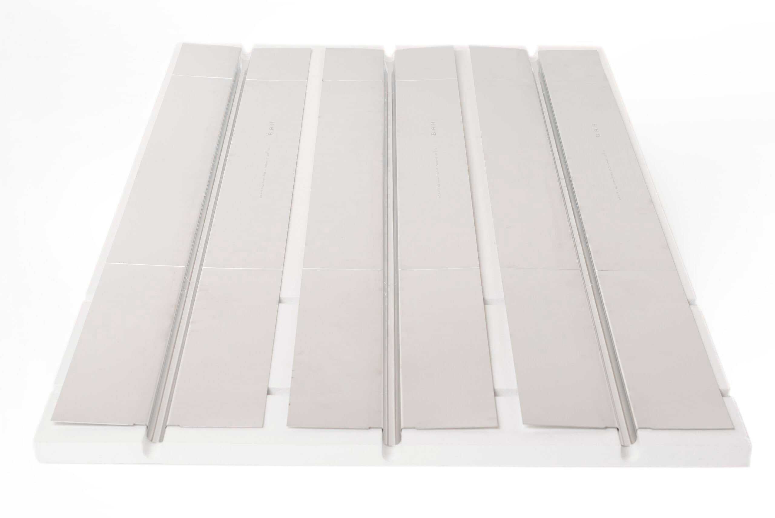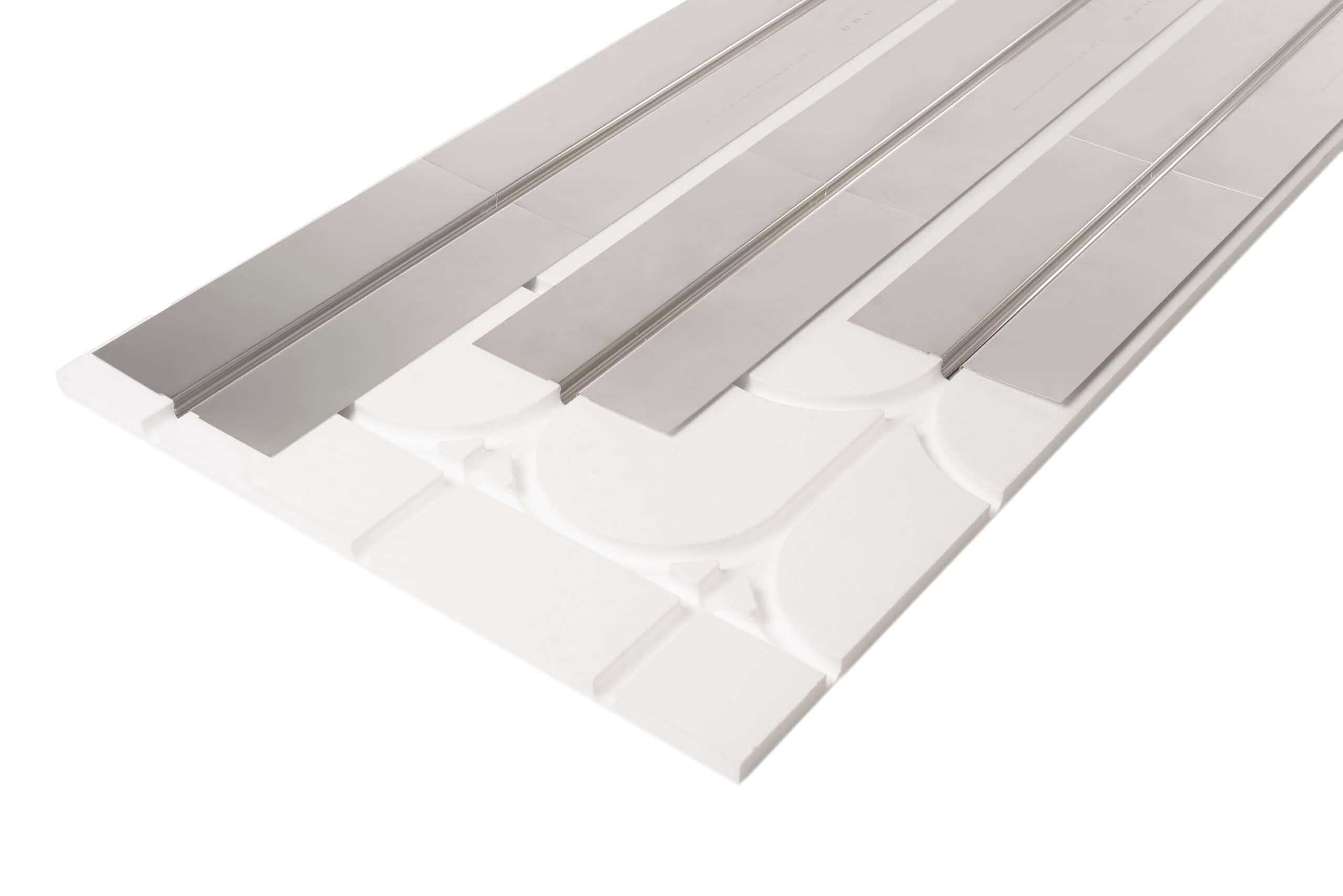 EPS platene leveres sammen med varmefordelingsplater i aluminium som sprer varmen i gulvet.