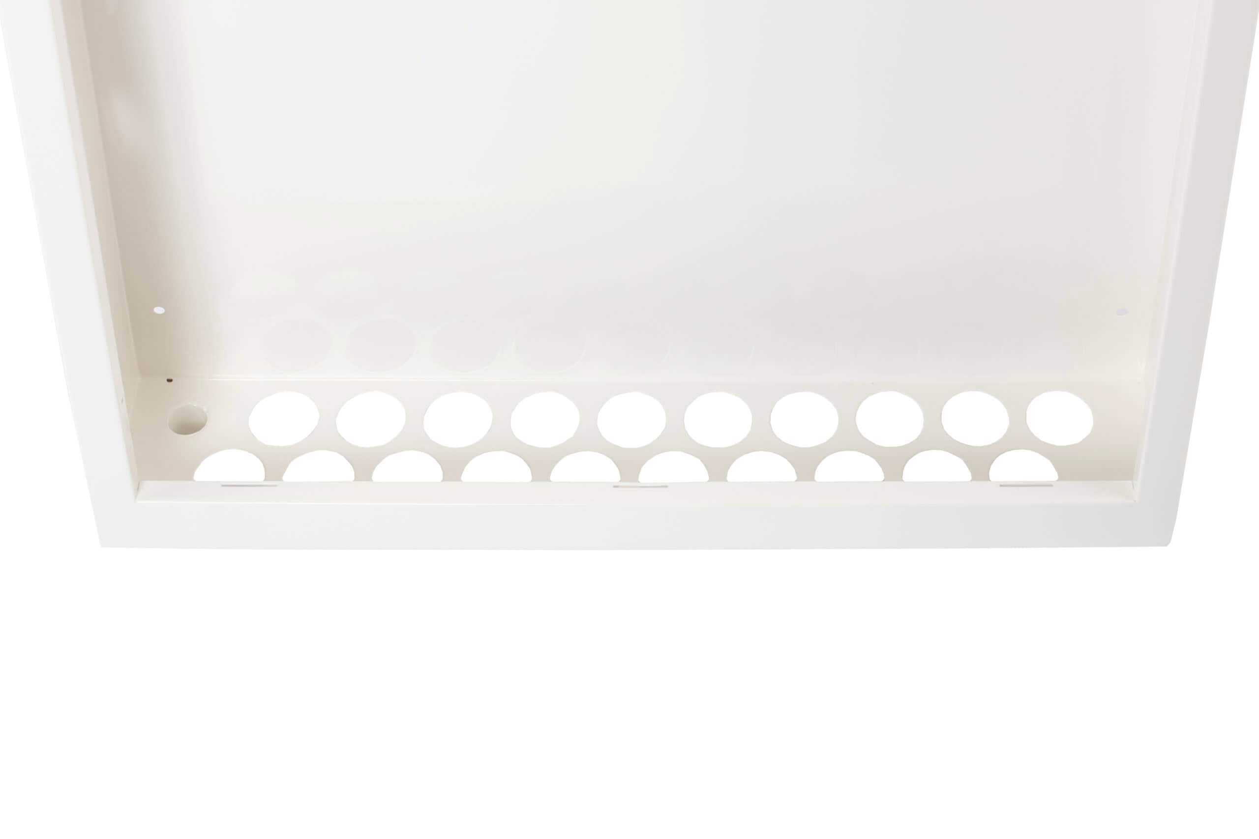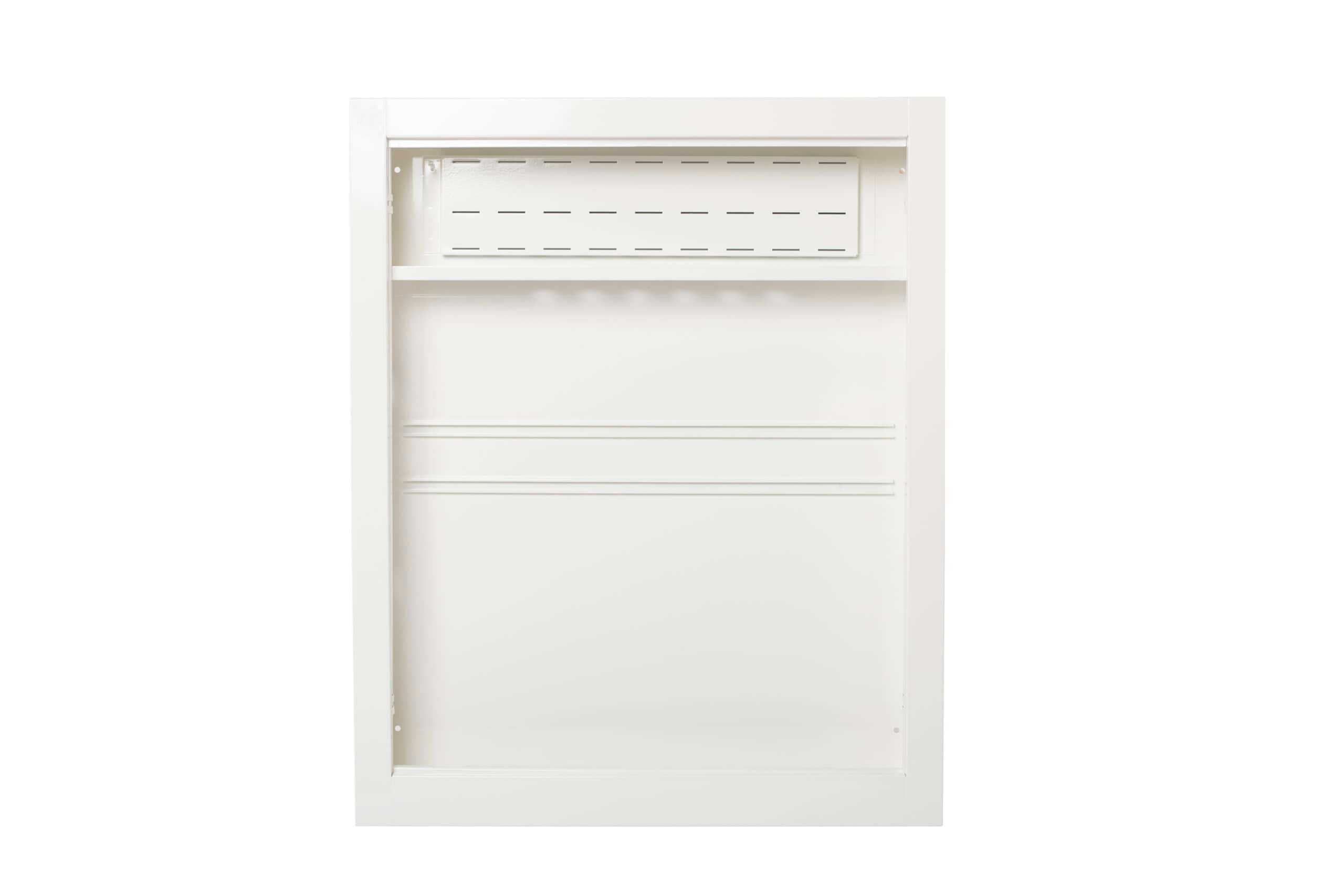 Skapet er utført i hvitlakkert stål, vanntett bunn og sprutsikker front. Leveres med gjennomføringer for avløp og egen monteringsplate for styremodul.