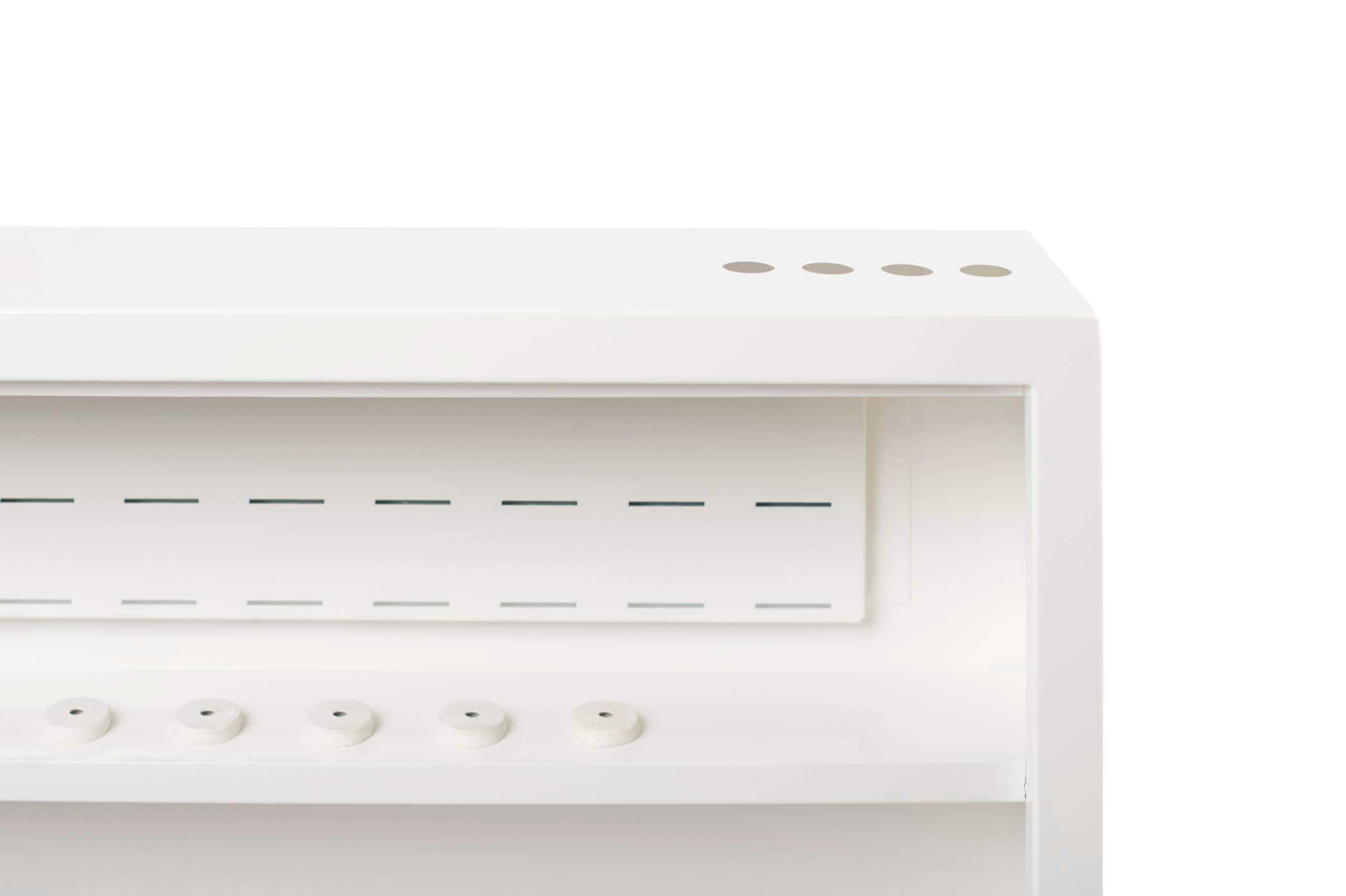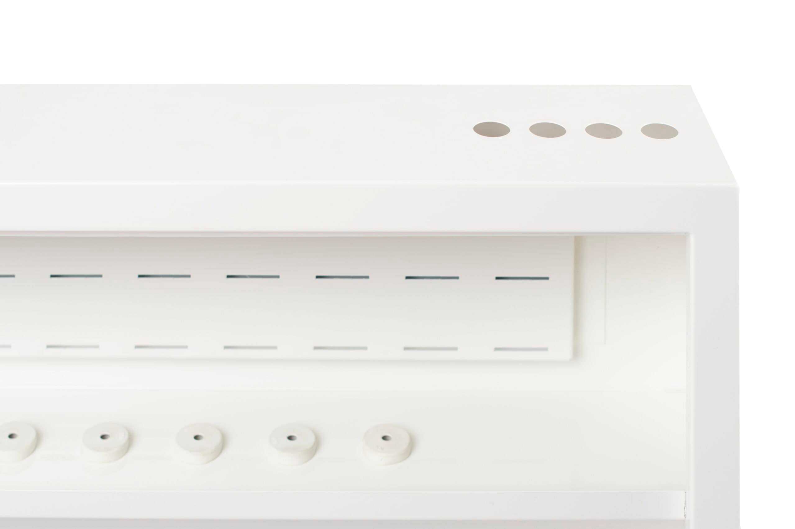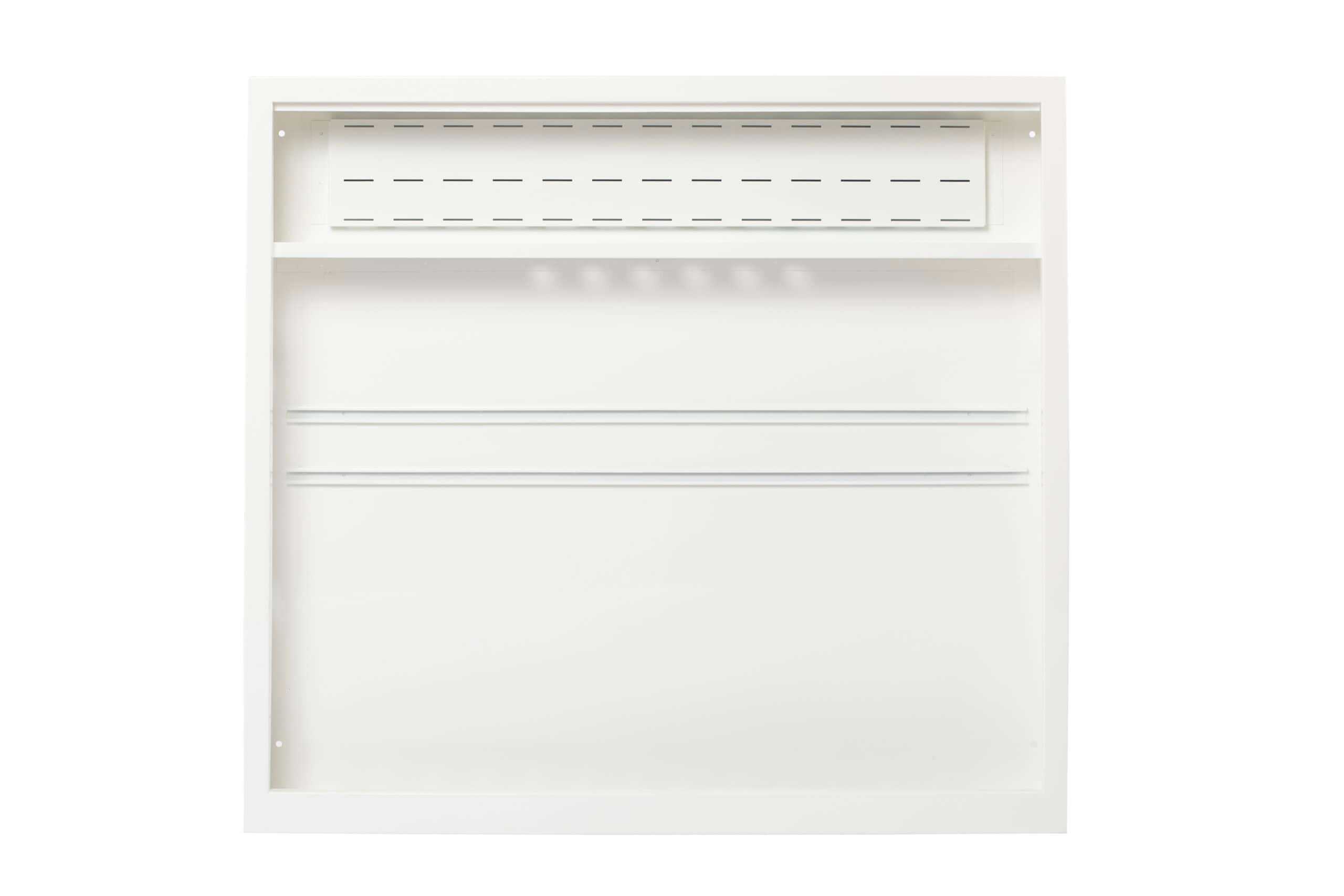Skapet er utført i hvitlakkert stål, vanntett bunn og sprutsikker front. Leveres med gjennomføringer for avløp og egen monteringsplate for styremodul.