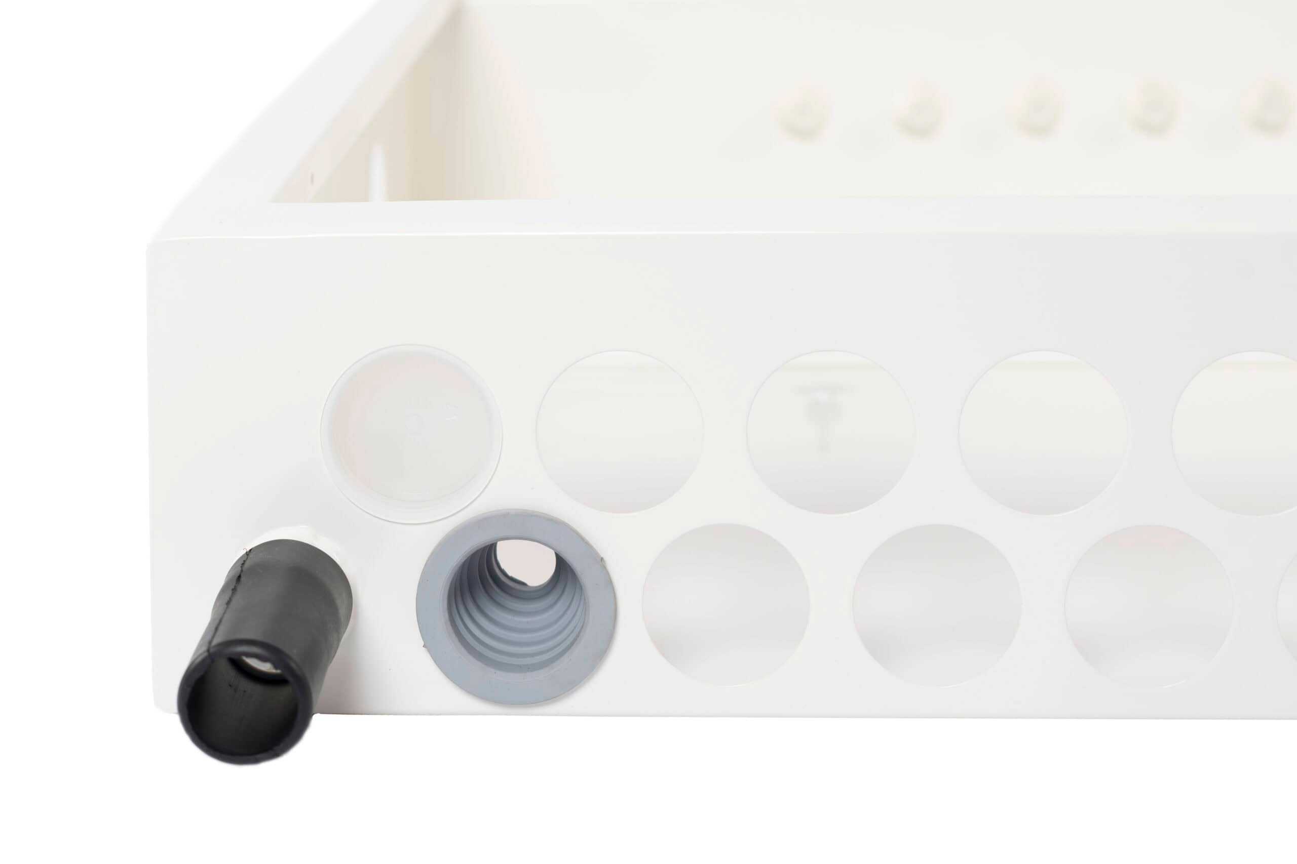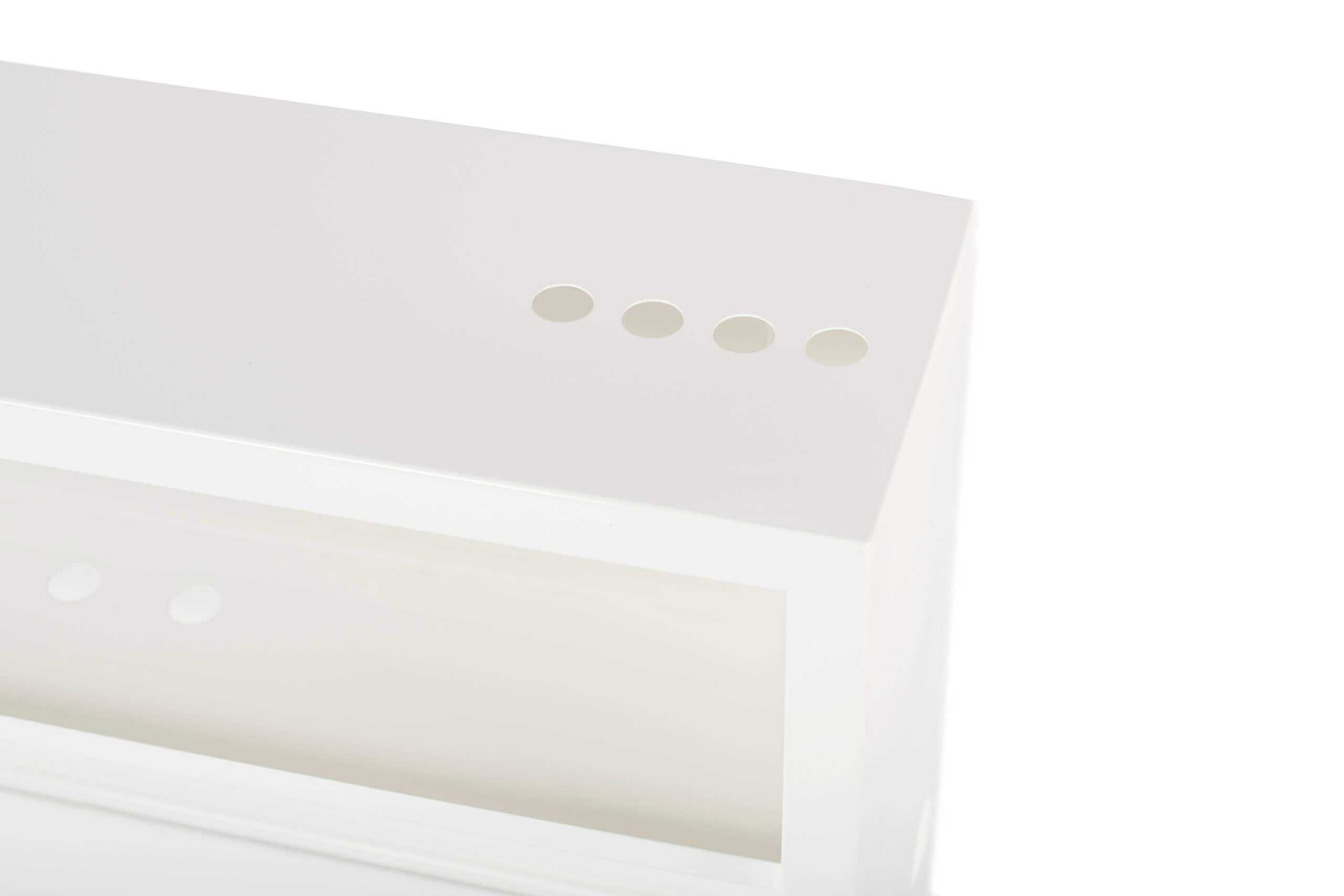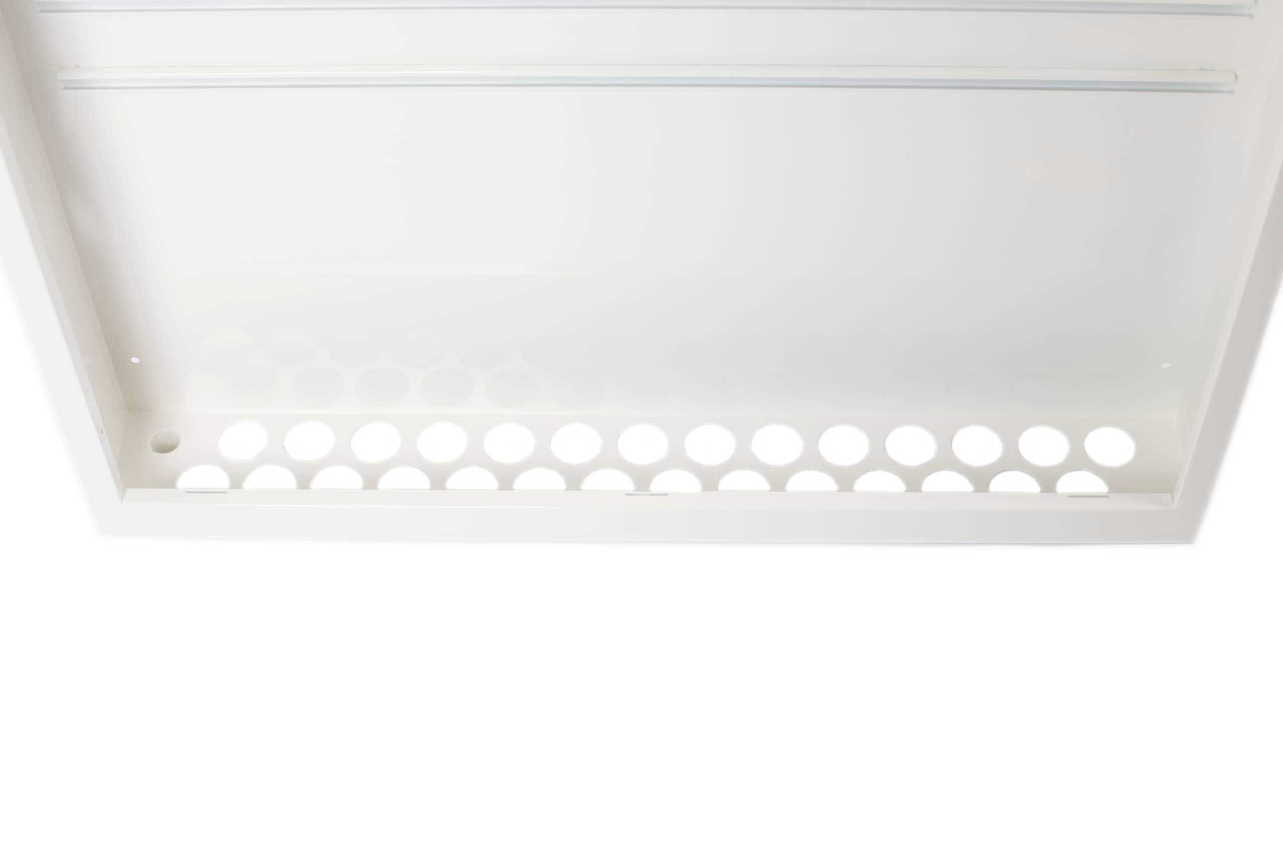 Skapet er utført i hvitlakkert stål, vanntett bunn og sprutsikker front. Leveres med gjennomføringer for avløp og egen monteringsplate for styremodul.