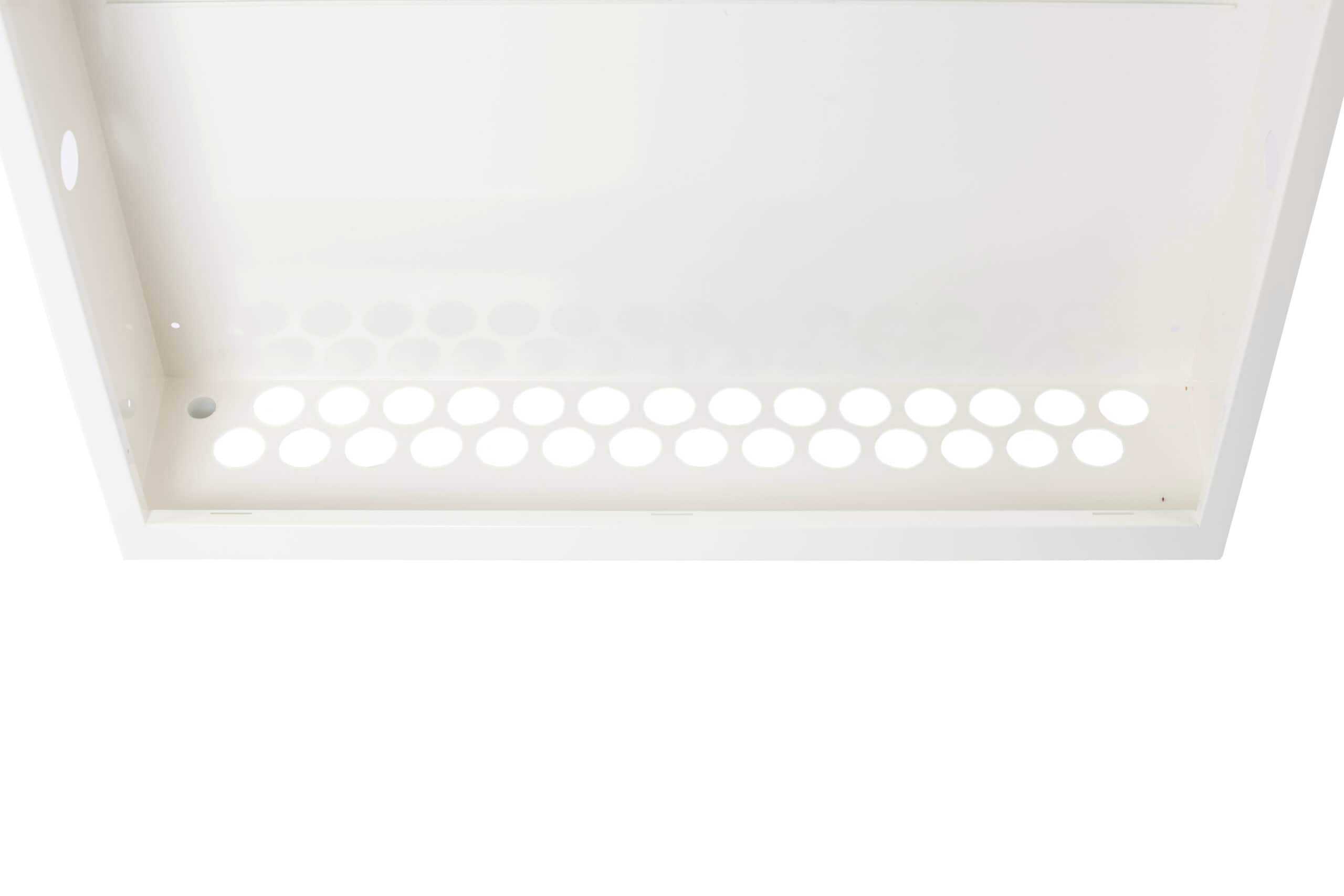 Skapet er utført i hvitlakkert stål, vanntett bunn og sprutsikker front. Leveres med gjennomføringer for avløp og egen monteringsplate for styremodul.